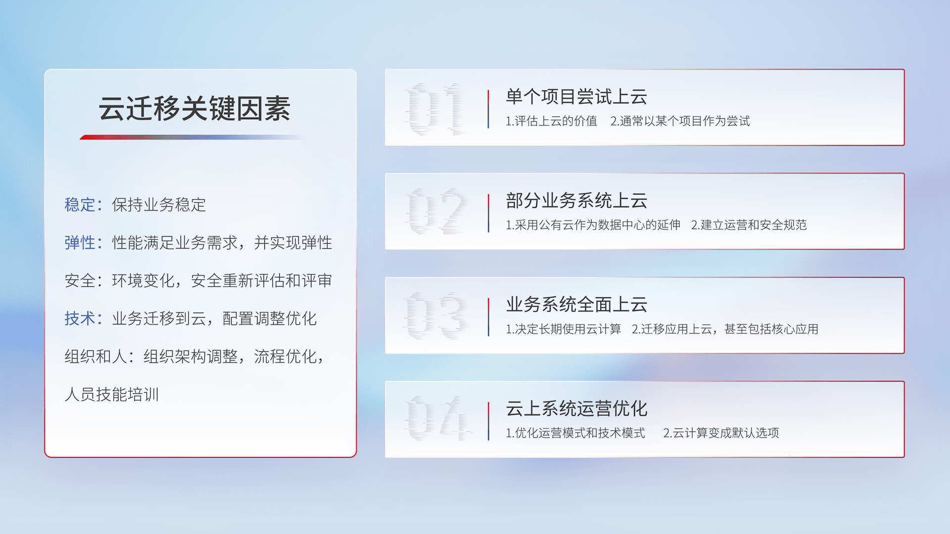 结合实际业务,,,,从规划设计、、、、云平台选型、、云原生改造、、、、数据迁移、、、集成交付,,迁移全过程为客户识别最佳上云路径,,,做好风险识别管理,,设计网络架构、、身份权限、、、安全审计合规、、、、操作审计、、、日志审计、、、监控告警策略、、多站点容灾设计等,,,对云上基础设施进行整体规划,,,提升IT治理水平,,,,以满足弹性、、高可用、、、、高性能的需求。。。