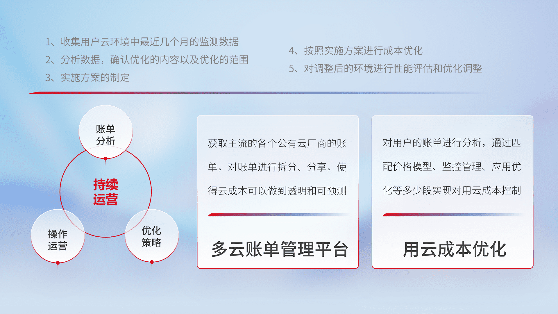 通过多云纳管,,以统一的资源数据模型把客户的云资源进行抽象和封装,,进而实现对多云资源的统一操作,,,,保障云资源管理的可靠性、、、稳定性与可用性。。。量身定制化运维内容,,,配置、、、开发运维、、、补丁管理、、备份、、、、监控、、认证和访问管理、、审计和日常巡检等,,,保障在用云过程中的可靠度,,,稳定度以及高可用率。。。。
