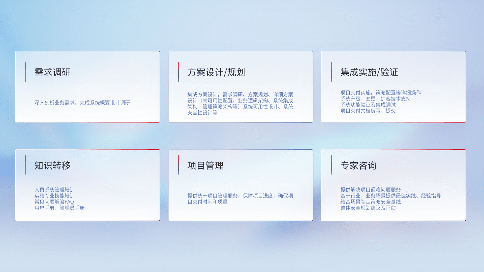 针对客户行业特性,,,将宏观的安全战略和需求,,,通过专业的交付服务,,,,实现项目落地,,,为客户提供标准规范的集成交付服务。。。