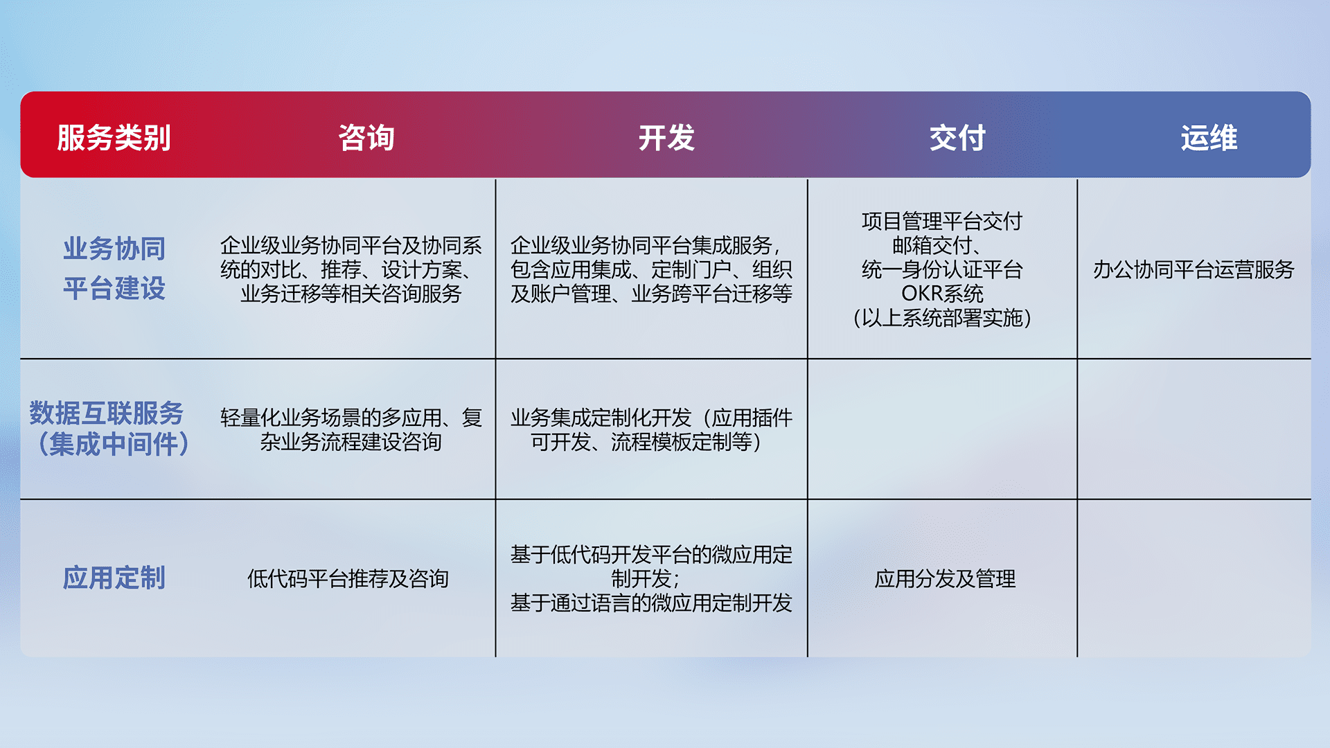 针对钉钉、、企微、、、、IDaas等平台级产品提供产品的规划、、、方案、、交付、、、定制化开发等服务,,,,实现如统一协同办公、、智能客户服务、、混合会议管理、、智能数据查询、、、等业务场景,,,,实现数字化转型。。